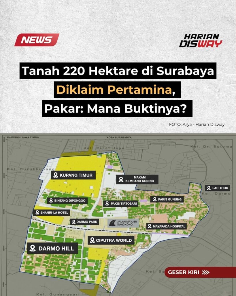 Seluas 220,4 Hektare tanah di Surabaya diklaim milik pertamina berdasar Eigendom Nomor 1278. Sengketa itu melibatkan lebih dari 2.600 tanah yang bersertifikat di kecamatan dukuh pakis dan sawahan. Bagaimana pakar hukum pertanahan memandang masalah itu? Dan bisa kah pertamina membuktikan bener tanah itu miliknya?