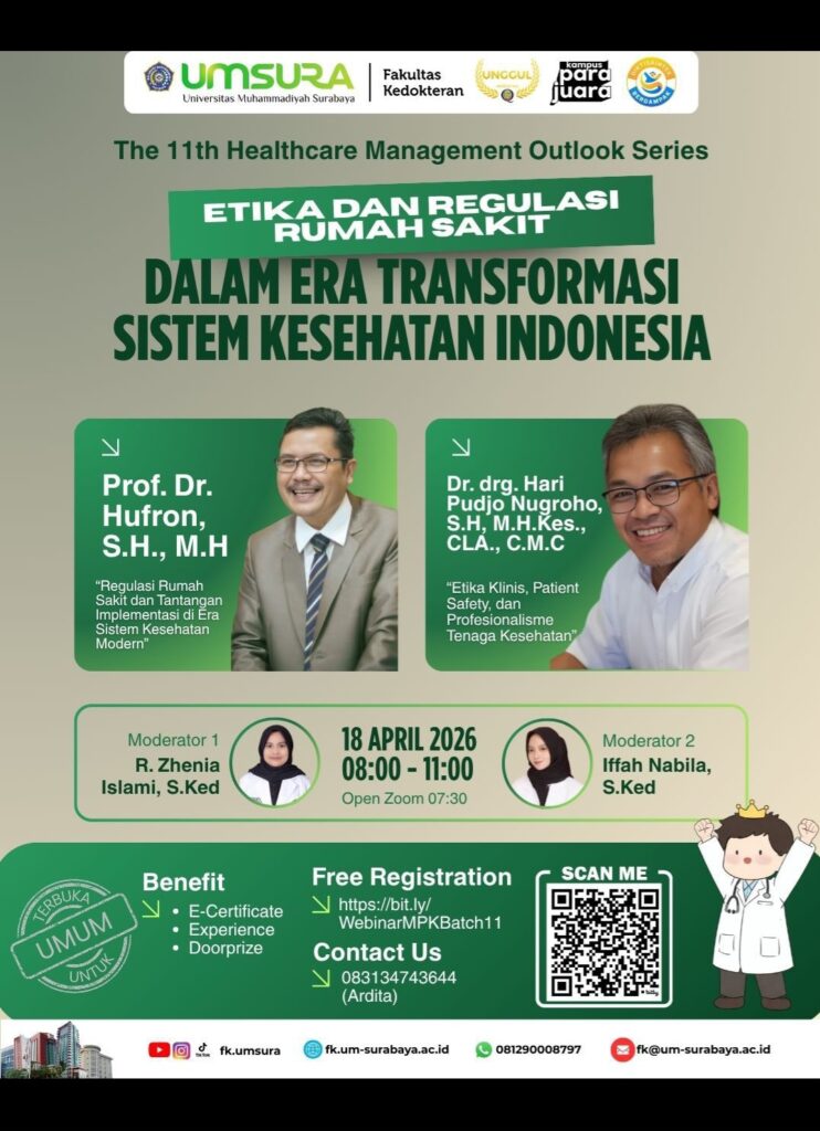 👨‍🏫 Menghadirkan pembicara inspiratif dan berkompeten:1. *Prof. Dr. Hufron, S.H., M.H*“Regulasi Rumah Sakit dan Tantangan Implementasi di Era Sistem Kesehatan Modern”2. *Dr. drg. Hari Pudjo Nugroho, S.H, M.H.Kes., CLA., C.M.C*“Etika Klinis, Patient Safety, dan Profesionalisme Tenaga Kesehatan”Sabtu, 18 April 202608.00 – selesai WIBVia Zoom & Live YouTubeLink Pendaftaran: *https://bit.ly/WebinarMPKBatch11*GRATIS tanpa biaya pendaftaranCP: Ardita (0831-3474-3644)(Link Zoom dan e-certificate akan dibagikan melalui grup WA peserta)Bersama kita wujudkan pelayanan kesehatan yang profesional, berkualitas, dan berintegritas.📍Save the date & jangan sampai terlewat!#WebinarMPK #MPKUMSURA #FKUMSURA